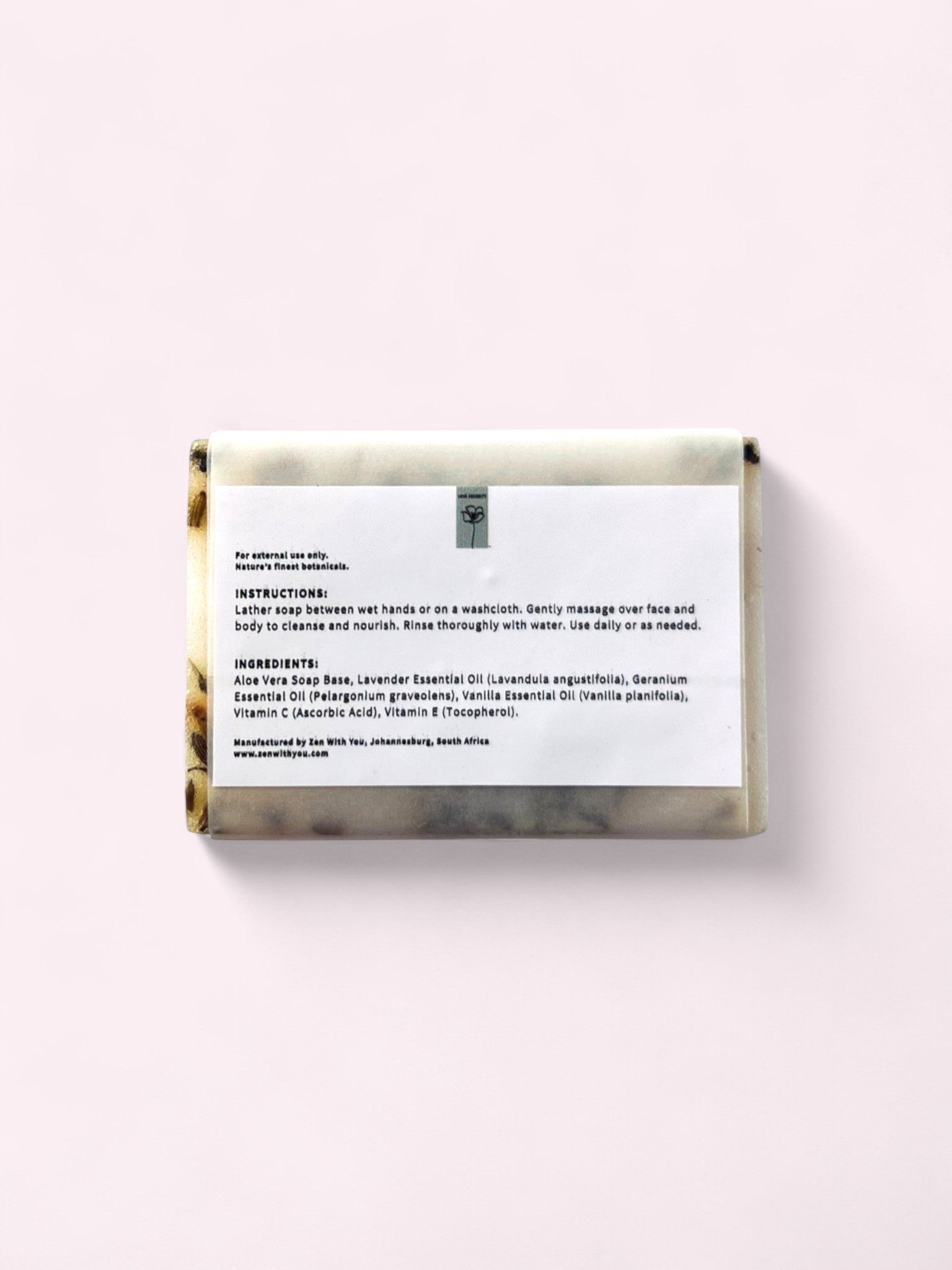 Aloe Vera Soap Base, Geranium Essential Oil, Lavender Essential Oil, Vanilla Essential Oil, Vitamin C Oil, Vitamin E Oil, Lavender Buds.