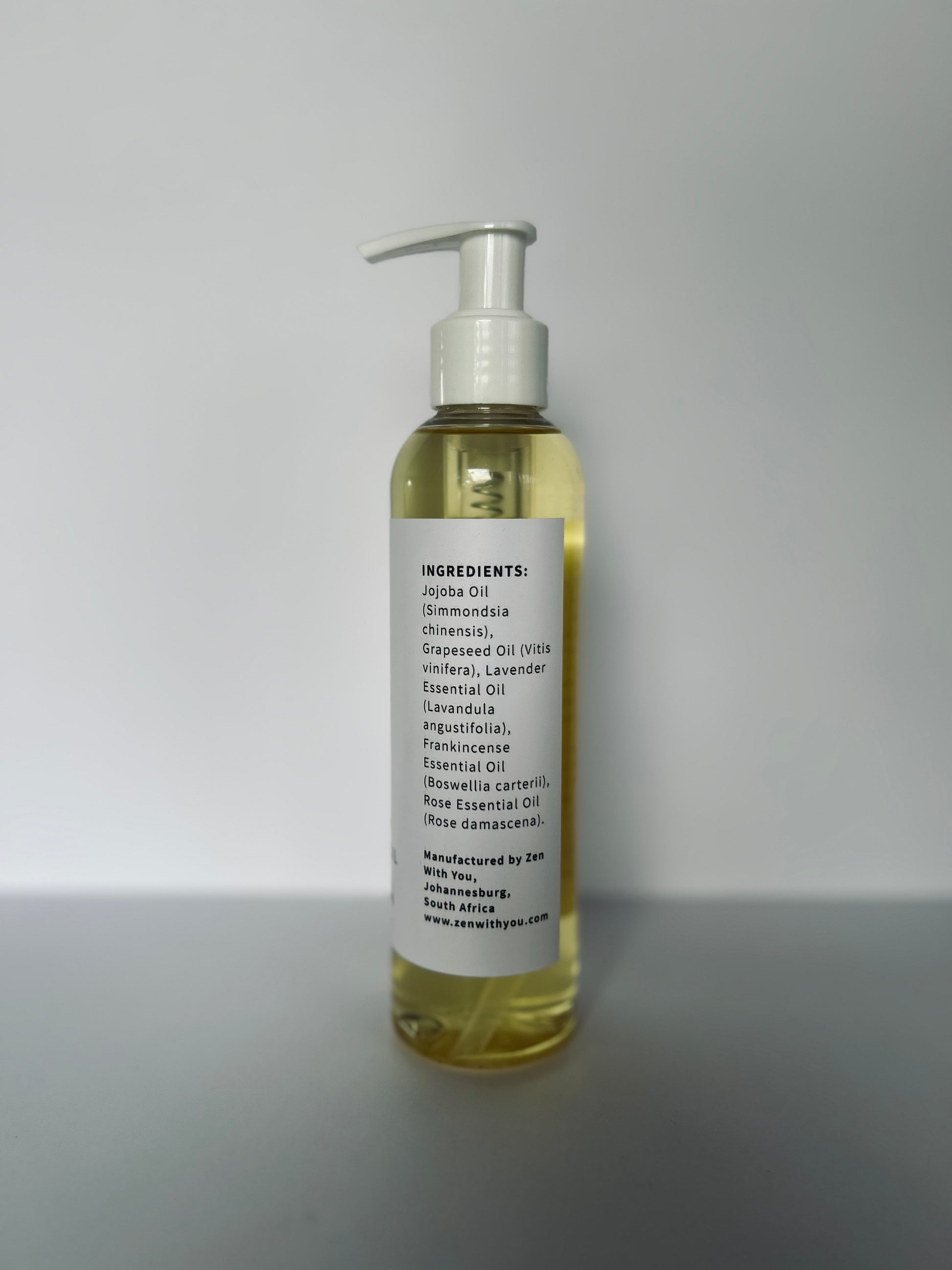 Jojoba Oil (Simmondsia chinensis), Grapeseed Oil (Vitis vinifera), Lavender Essential Oil (Lavandula angustifolia), Frankincense Essential Oil (Boswellia carterii), Rose Essential Oil (Rosa damascena).