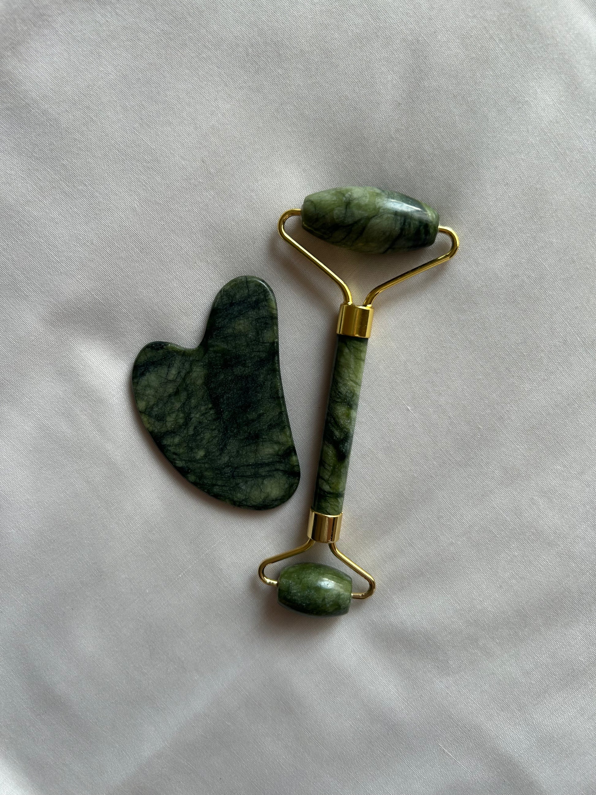 Refresh and relax your skin with this set of two timeless tools: a cooling face roller and a sculpting gua sha. Use the gua sha to gently massage and lift your face, boosting circulation and easing tension, then follow with the roller to reduce puffiness and soothe your skin. Perfect for a daily self-care ritual that brings calm and glow.